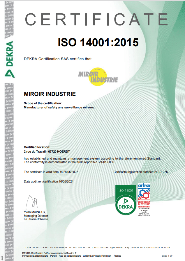 Nuestra fabricación de espejos de seguridad cumple con las exigencias de la norma internacional ISO 14001:2015.