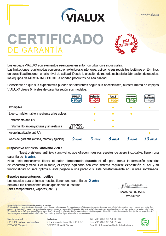 Consulte, en función de la calidad de fabricación de nuestros espejos, los compromisos de garantía que le ofrecemos. Puede descargar este certificado de garantía haciendo clic en la imagen contigua.